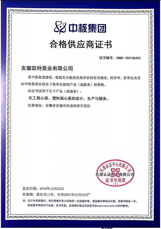 Certificate of Qualified Supplier of China National Nuclear Corporation (CNNC)